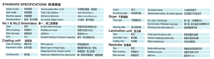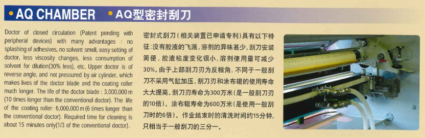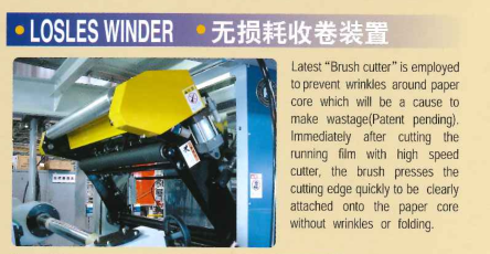 該設備標準配備有“密封式刮刀”,“無損耗式收卷部”,匯集有降低廢品率的種種技術,是操作簡便,高線率運轉的最新型干式復合機。